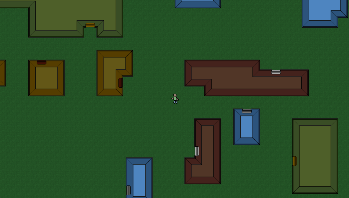 I wanted to be able to enter multiple houses, so I needed a city. I realized that I could use the same binary space partition algorithm that I used for houses to create cities. There are different ways to use BSP. For houses, I decided not to trim down the spaces. That works for a dungeon style with a hallway between rooms, but this isn’t that kind of game. For cities, however, we don’t want the houses right next to each other. We want yards and roads and dirt paths and such. So a partitioned space has a smaller space somewhere in it where the house will be placed. This leads to the next type of procedural generation: Rectangle Overlapping.